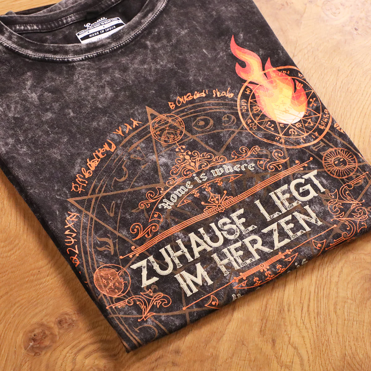 Represent our favorite angsty wizard with this hot sigil-based design on an acid black cotton shirt. This Caleb Widogast shirt features the saying "home is where the heart is" in both English and German (reminiscent of Common and Zemnian).