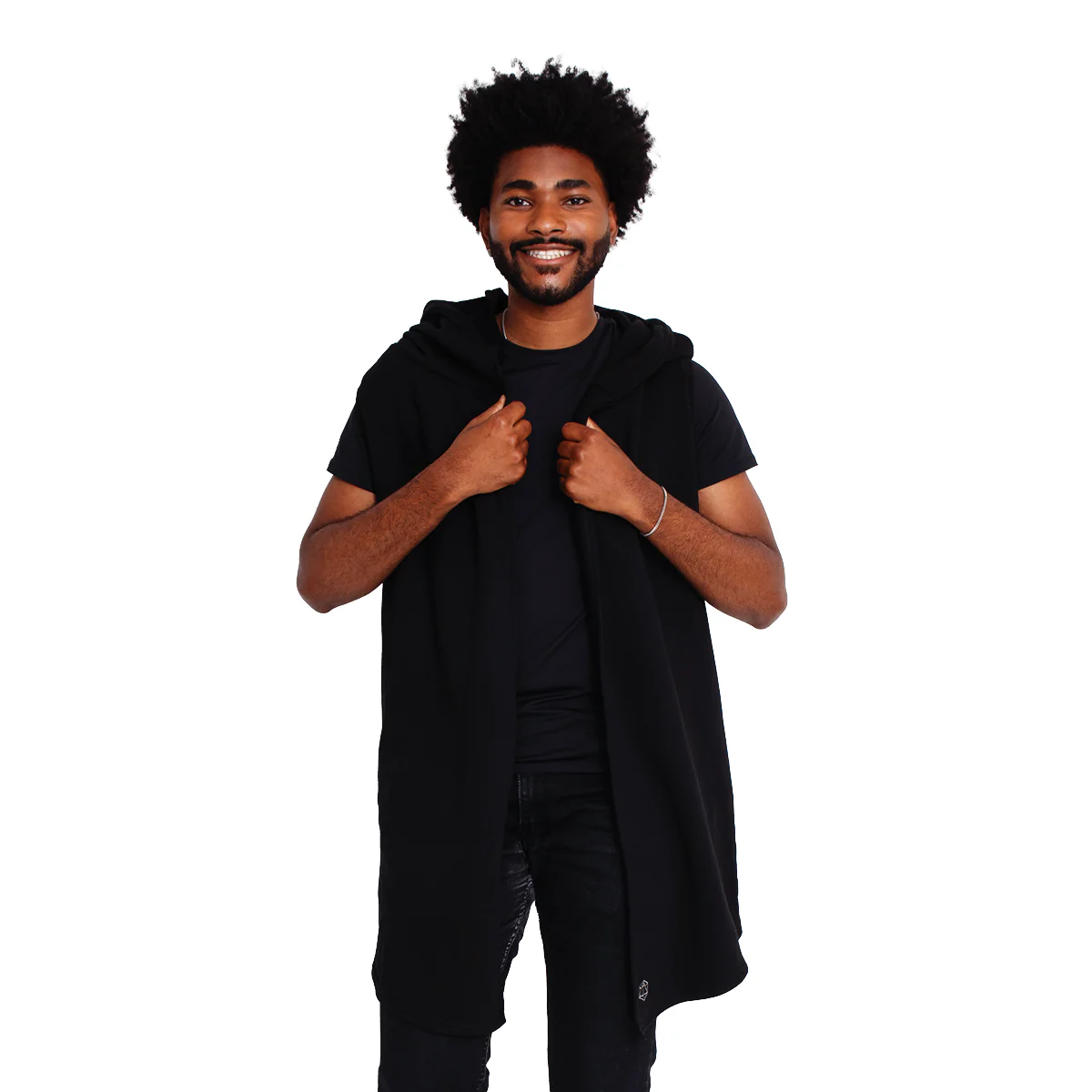 This sleeveless, hooded cardigan, inspired by Vox Machina’s Vax’ildan, is perfectly fashioned for a divine warrior to cloak their daggers! The back features a large tonal print of a raven's skull, a snake, and three daggers with gold foil details. Toss this on over your favorite t-shirt, crewneck, or tank for a cool and edgy look befitting of a fighter chosen by The Matron of Ravens.